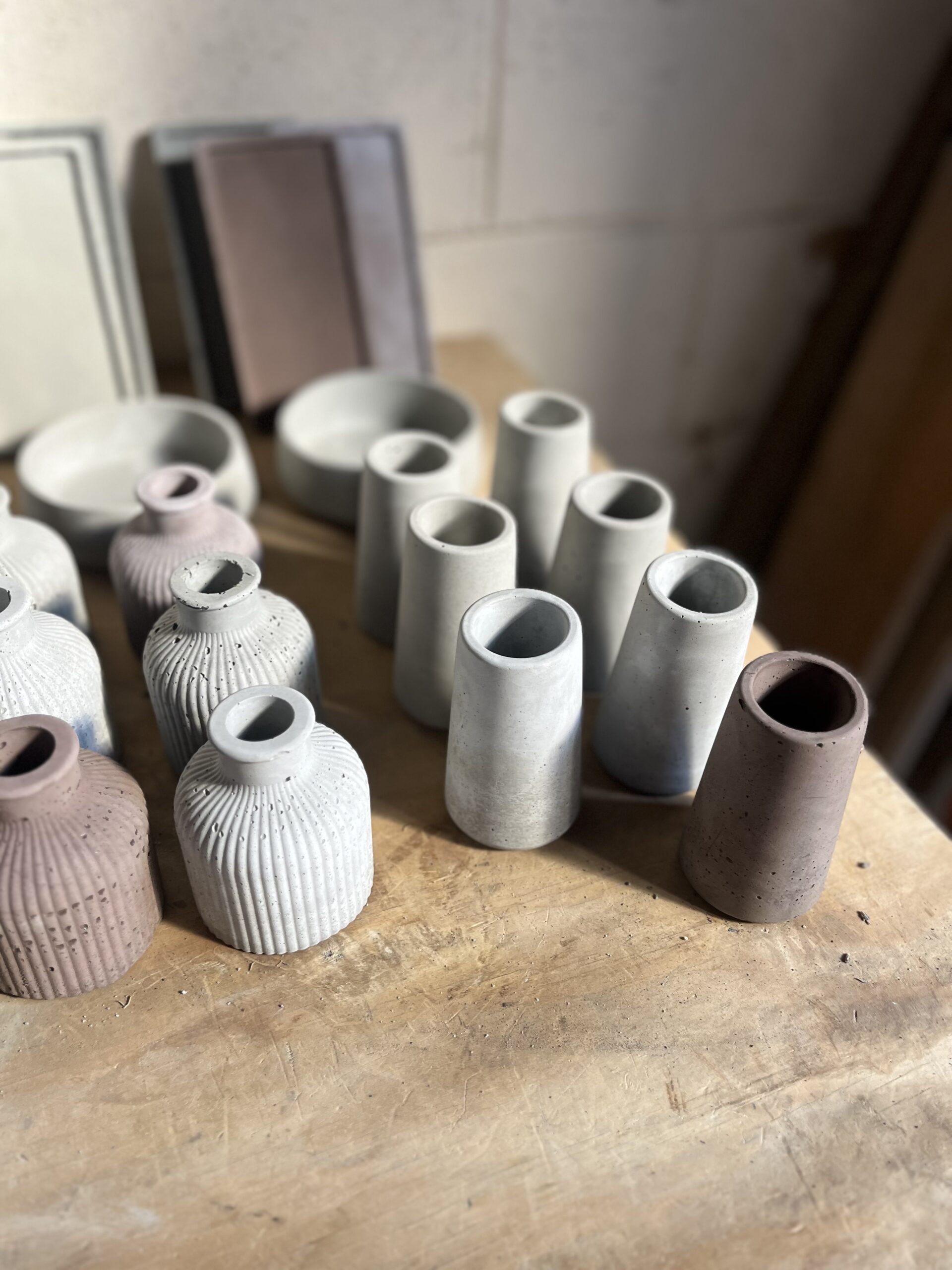 Available in soft natural hues — warm blush, stone grey and earthy clay — the collection features a mix of smooth cylindrical forms and delicately ribbed designs. Their compact size makes them perfect for single stems, dried botanicals or small floral arrangements.